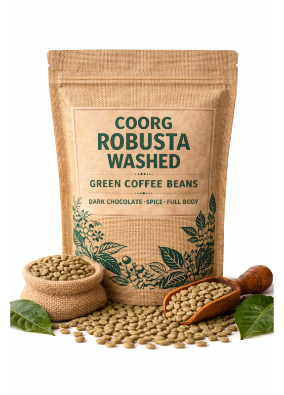 Discover the bold and distinctive character of Coorg Robusta Washed Green Coffee Beans, sourced from the lush coffee estates of Kodagu (Coorg) in the Western Ghats of South India.